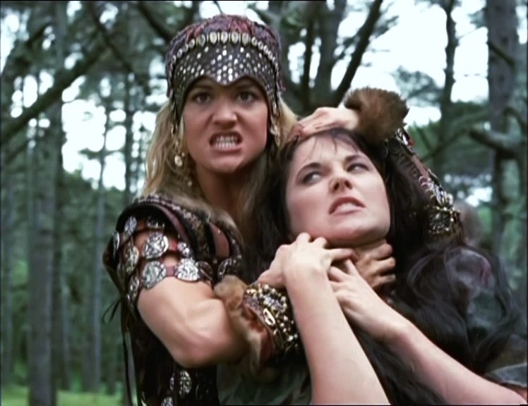 Later Xena and Otere relax in the steam in the banya to purge their minds and bodies. Xena explains to Otere that the Amazons used to use this time to purge their spirits, like the steam purges their bodies. Xena knows that they have to develop spiritual powers of their own if they want to beat Alti. Recalling one of the last times she was in a banya, Xena remembers battling Cyane, the Queen of the Amazons. They take the fight outside, but Xena has clearly met her match. Just as Cyane is about to kill Xena, Borias arrives and convinces her to release Xena in exchange for peace.