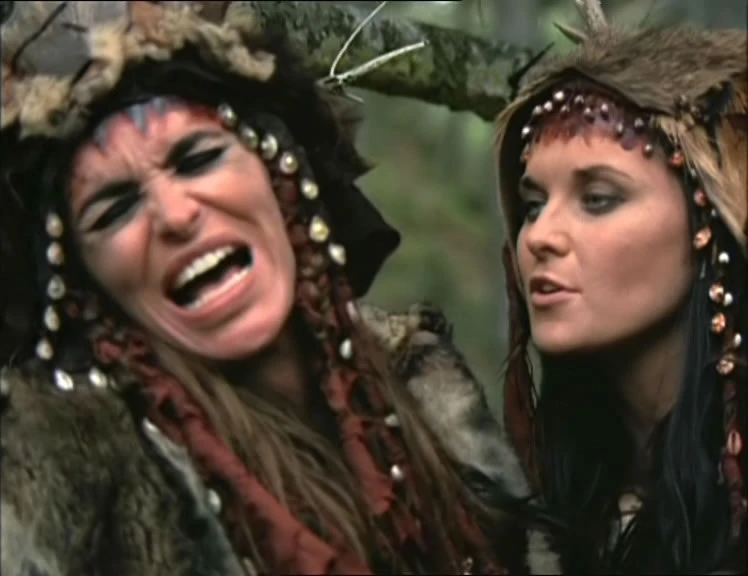 As Xena and Alti begin to battle, the evil Shamaness continues to inflict psychological terror. Instead of reliving her past, Alti forces painful scenes of the future onto Xena. Just when it appears that Xena is beaten, a vision of Gabrielle from the future appears in Xena's mind -- Gabrielle is alive! Xena, with renewed strength, impales Alti on a sapling, releasing the curse on the Amazons. Xena's spirit returns to her body and she takes the "pinch" off of the others.