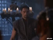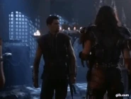 The group rushes to the Chakram Chamber and Xena retrieves the chakram of light. When she exits the chamber, her friends are surrounded by Ares, Kal and his guards. Ares and Kal freeze when they see that Xena has the chakram, but she can't make the kill and drops it to the ground.
