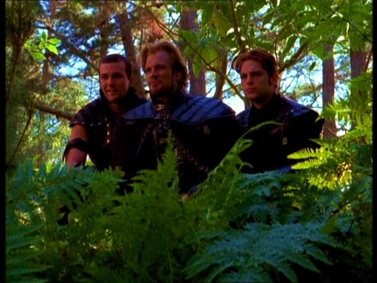 Later, as Morloch's men trudge through the woods searching for their prey, Xena grabs a henchman without being seen. Taking his weapon and the keg of flammable liquid he is carrying, she and Varia gag him, suspend him from a tree and use him as bait to lure Morloch. While they watch from a distance as Morloch's henchmen cut him down, Morloch secretly watches Xena. Suddenly sensing trouble, Xena pulls Varia behind a bush, switches clothes with her and manages to get the drop on "Morloch," clocking him with her chakram. But she quickly discovers that her victim is actually Morloch's henchman dressed as the prince. Spurred on by the competition, a gleeful Morloch appears in the entrance to a burial catacombs and invites Xena inside.