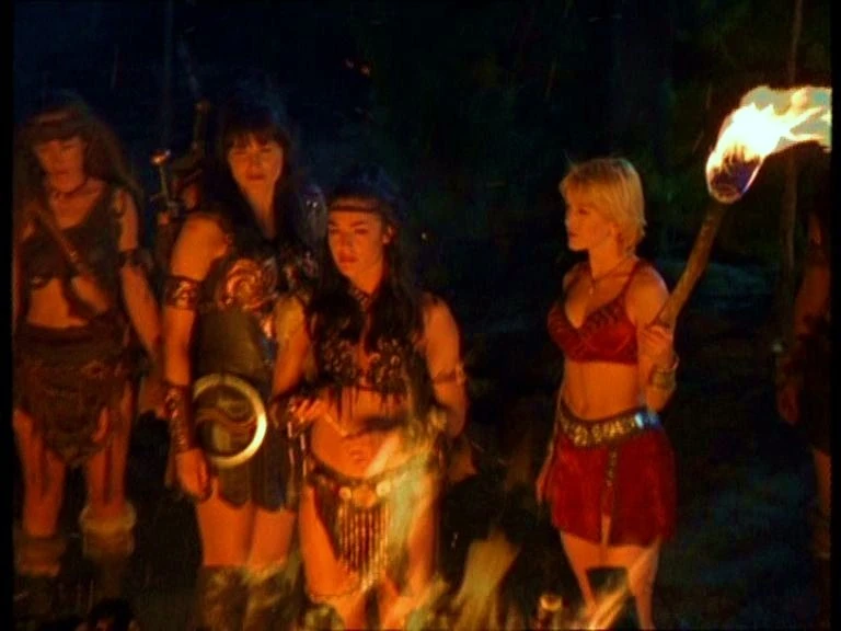 Later at the Amazon village, Gabrielle lights Marga's pyre on fire. The Amazons are all gathered around, as Xena and Gabrielle move over to Varia. Xena hands Marga's royal necklace to Gabrielle who places it on Varia, officially making her Queen of the Amazons. Varia tells Xena she has so much to learn to honour Marga's memory. Xena hugs Varia, and tells her she doesn't owe her anything after she says she is in her debt. The Amazons mourn in silence, looking at the burning pyre.