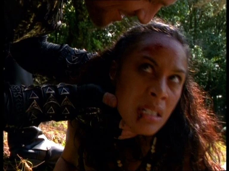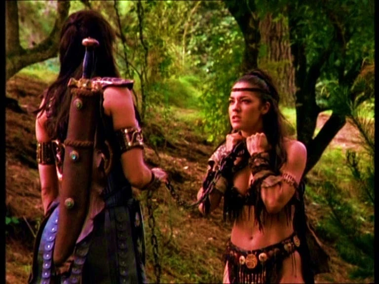 Determined to find Marga's killer, Varia sneaks off again but is quickly caught in a trap that yanks her skyward. As she struggles to free herself from Morloch's right hand man Raczar and his henchmen, Xena arrives, overpowers the attackers and sends them fleeing back to their camp. When an irate Varia tries to follow, Xena fashions a leash from the chain of a metal trap and secures it around Varia's neck.