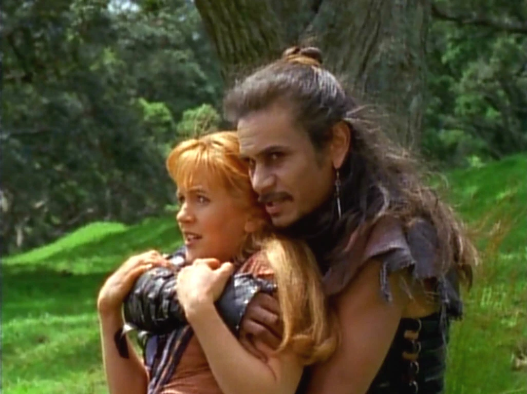 Meanwhile, Xena and Gabrielle travel through an apple orchard in the forest. They notice a playful couple picking apples for each other laughing and kissing. Gabrielle regards them turning to Xena telling her they look like they're having fun. Xena turns, barely noticing them or bothering to care. Gabrielle doesn't envy them but questions what she has that she doesn't and thinks about the important things in life: travel, adventure and meeting interesting people. Gabrielle attempts to pick an apple from a tree, she moves to pick one when an arrow shoots through it. Gabrielle turns to see the evil thug Toxeus and his gang of thugs. They confront Xena. He knows her as the legendary Xena. Xena doesn't recognize him asking who he is. He tells her his name, and that he saw her fight in Nesra a while back. His army could use a warrior like her. "Join a band of worthless, lowlife scum? I think I'll pass." Toxeus pities Xena but warns her he has a strict recruiting policy. Join or die. He draws his sword and attacks.