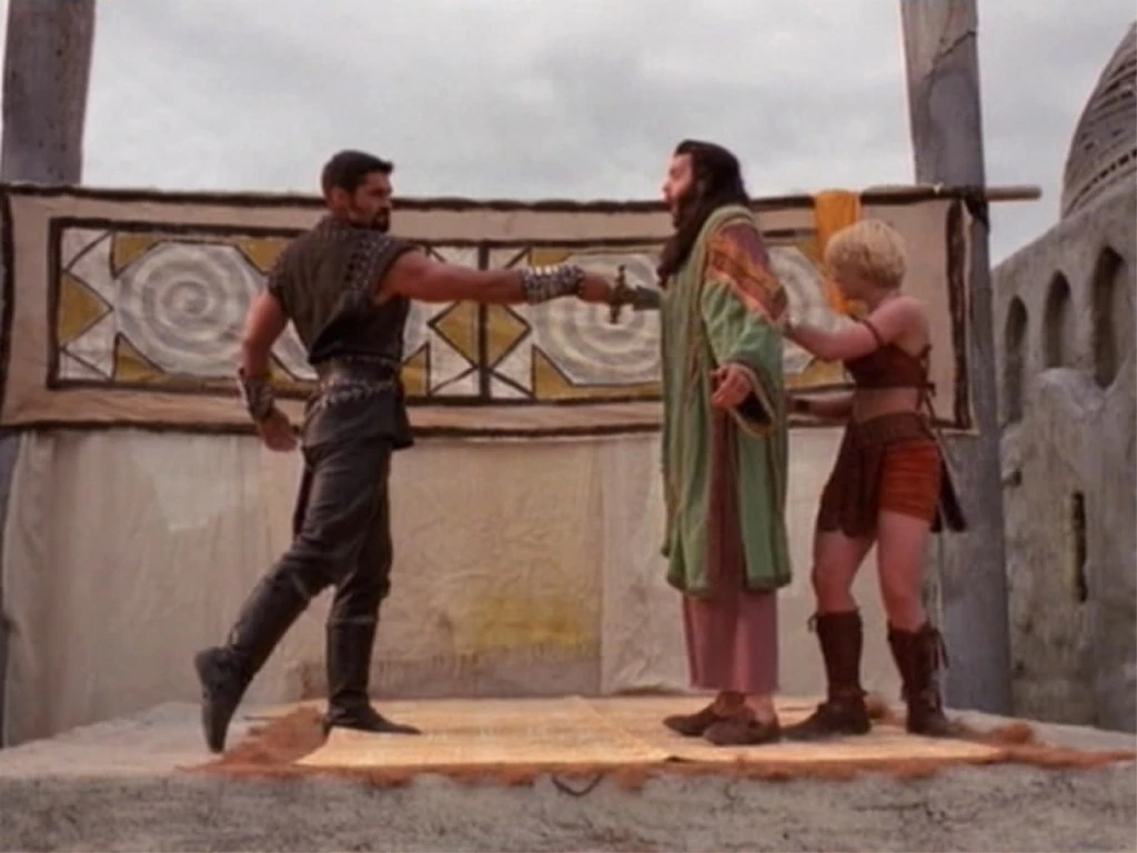 After Eli saves Gabrielle from Tataka, the people now believe that Eli is an avatar, a god in human form. When Xena and Gabrielle meet a group of people worshipping a man, they find that the man is Eli, who is now trying to accept that he is the avatar, but is unsure of his new-found powers, telling Gabrielle: "When I thought you were a devi. You seemed to have the power to heal people. That thing I sought after all my life. I envy that. Now I have this power to heal people and cast out demons, give people hope. And it terrifies me." The three later meet Hanuman, who tells Eli that the Demon King Indrajit is hunting him and that he should seek the assistance of Krishna. As they travel to Krishna's temple, Eli tells Gabrielle about his way of life, and that there is only one universal truth and that is reverence for life, and that fighting is never allowed. When they arrive at the temple they are confronted by minions of Indrajit, Xena battles them as Eli, Gabrielle, and Hanuman flee into the temple. Indrajit attacks villagers outside the temple to lure Eli out and captures him.