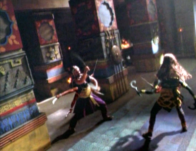 Inside an Indian temple and man and woman with multiple arms fight each other with various weapons. Xena arrives and frees Gabrielle from the hands of Indrajit by cutting off his hand with her chakram. He begins growing more arms until he has six, he grabs swords and axes and begins attacking Xena and he manages to disable her long enough to sever both her arms. While lying bleeding on the floor she calls on Krishna for help and as she is imbued with the power of Kali she grows four new arms and springs back into battle. She beats Indrajit by cutting off his head. Now free from the demon, Gabrielle relinquishes her past as a warrior and chooses to follow Eli's Way of Love, whereas Xena becomes even more firmly rooted in her Way of the Warrior. Gabrielle throws her staff into the river and Xena suggests that Gabrielle should travel with Eli because she and Gabrielle are following different paths, but Gabrielle says they should stay together since even though they are on different paths they will end up in the same place.