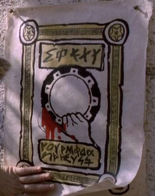 - Unlike most of the "Greek" writing in the Xenaverse, the poster for this play actually uses the Greek alphabet, mostly. Although legible, it's still utter gibberish.