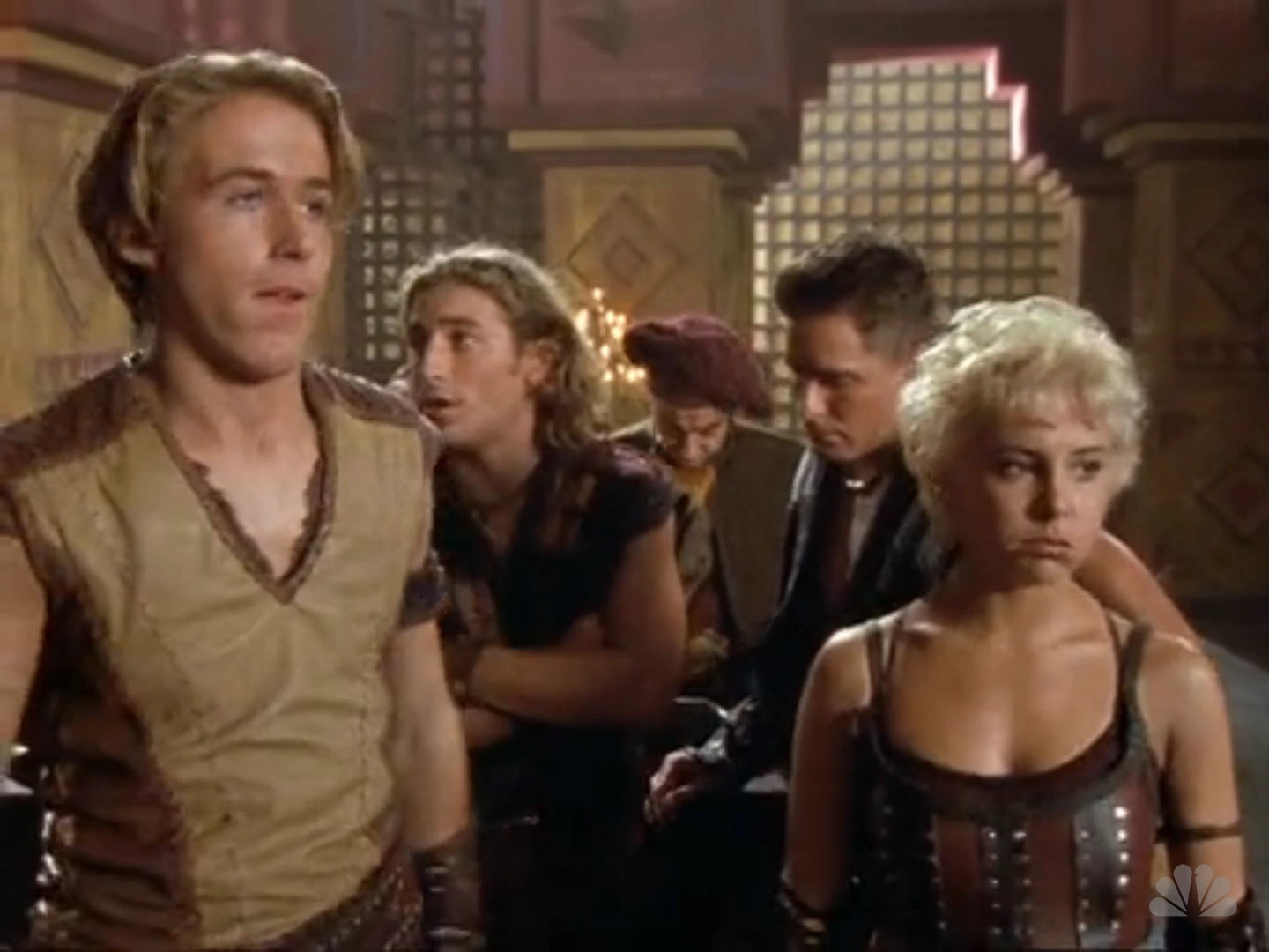 The gang has tied up Fiducus and Lilith in two separate areas of the academy and are talking to Iolaus in the main hall. Iolaus also has his hands tied. Iolaus spots Hercules, and through a series of hand motions they set up a plan.