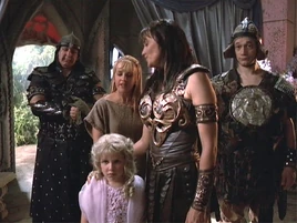 Outside the castle. Alesia stands with her parents and is happily reconciled with her new stepmother. Xena stands with Gabrielle and Joxer, and explains to Alesia the ending of the story with a happy ending. Aphrodite laughs and appears and she tells Alesia that her stepmother does love her. And Xena tries to get Aphrodite to admit she cares about a mortal, but she leaves in her own way of not admitting it. Xena wonders what prompted Gabrielle to come back. Gabrielle returned to Xena after realizing that family is about staying together through problems. A heartfelt moment follows with Alesia hugging her mother, the Queen, and Xena embracing Gabrielle and Joxer. As they part ways, the mood lightens with Gabrielle beginning to tell a story about a wooden boy whose nose grows when he lies, hinting at a playful version of Pinocchio, while Joxer offers a silly twist.