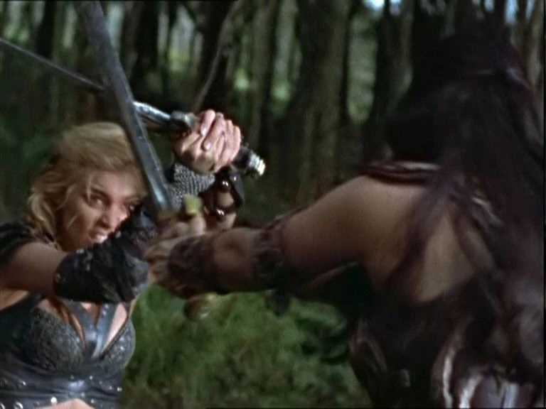 Xena and Callisto finally come face to face and the battle is on! Swords flash as the evenly matched opponents pull out all the stops. Eventually, Xena gets Callisto in a scissors lock and wrests a dagger from the evil one's hand. As she raises it over her head, however, Gabrielle suddenly appears and points her deadly pike at Xena, whom she believes to be Callisto. After a tense moment, Xena convinces Gabrielle of her real identity, but Callisto manages to get away.