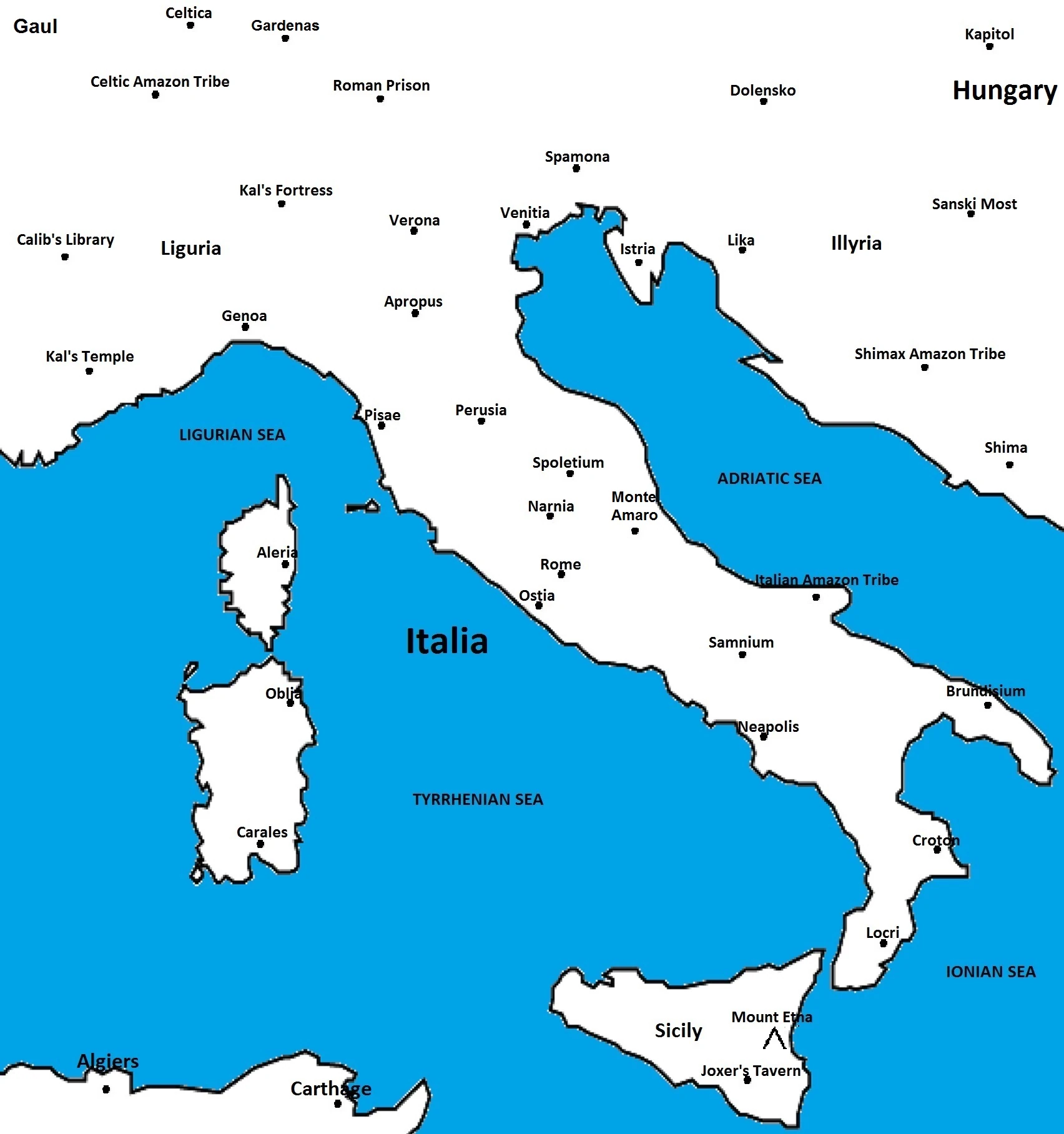 Italia, also known as "Italy" or the Roman Empire, is a country located in Southern Europe. Xena and Gabrielle often travelled to Rome, it's capital city. Ares took them to the foot of Mount Etna, located in Sicily, after they were presumed dead in "Looking Death in the Eye". This is where Joxer and Meg set up a tavern.