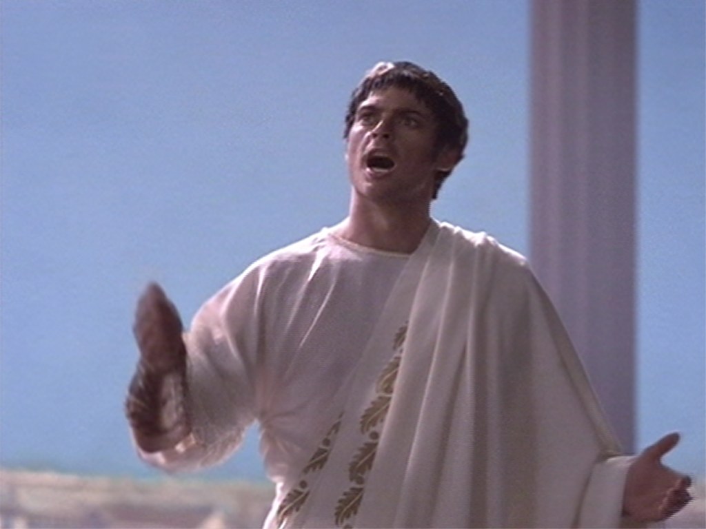 Caesar first appeared in "Destiny". Xena had been badly wounded in battle (and later died) and we see a flashback ten winters ago, when he and Xena first encountered. He appeared as a young, arrogant Roman noble. Xena seduced him, but even then he knew what she was trying to do. He successfully tricked her into believing that he would be waiting for her. When Xena reunited with him, he crucified her and broke her legs, along with her ship's entire crew. She was then rescued by M'Lila.