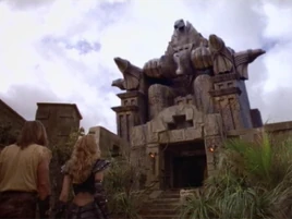 - The sculpture at the top of the entrance to the labyrinth was originally seen as the headpiece for Megolith 2 in "Doomsday."