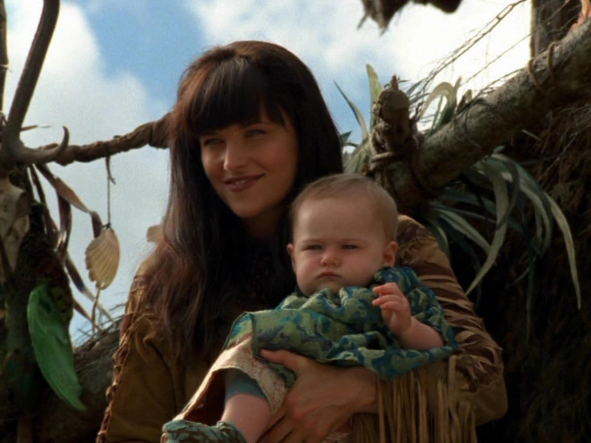 In the present, Gabrielle decides to give her Right of Cast in the Amazon tribe to Eve, which would make Eve an Amazon princess. Gabrielle, Xena and the baby travel to the Northern Amazon village. Xena is a bit dubious; she says she has known violence and bloodshed and doesn't want Eve to know such things. But Gabrielle tells here, "Xena, we're all family. I love her like my own daughter." And Xena says if that's how you really feel, then we'll do it.