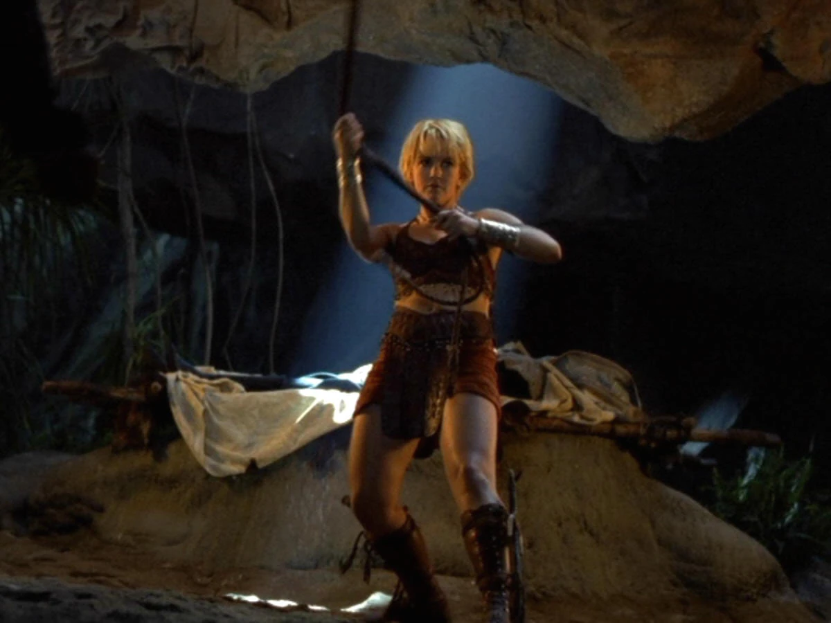 Meanwhile, the masked warlord Tharon is sending out men lead by Sandor to find Xena. Gabrielle fights off a whole attack squad of them with a makeshift whip lit on fire in order to protect Xena's body. After the squad runs off, Aphrodite is asked to seal the cave which she does even though she indignantly points out that her magic was not wanted earlier.