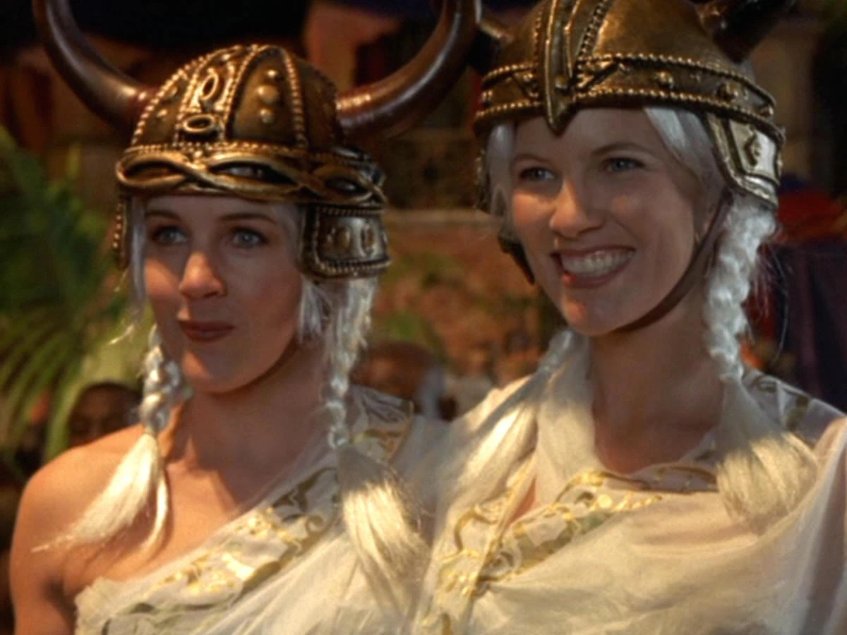 - Castor and Pollux speak to Gabrielle and Aphrodite in Swedish (making a vulgar proposition), a language neither of the ladies speaks or understands. When Aphrodite-playing along-compliments the two boys on their accent, one of the boys replies "Yes, we pride ourselves on being cunning-linguists" (double-entendre intended).