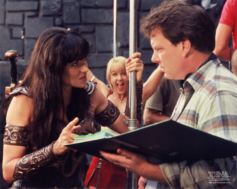Rob Tapert directs Lucy, whilst Renee O'Connor jokes around, during the filming of the finale of Xena: Warrior Princess, "A Friend in Need Part I."