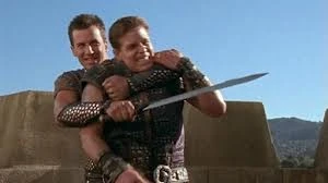 They get to the top of a tower and Jason and Lucius face off. Hercules arrives. Lucius throws Jason off the tower, but Jason manages to grab old of a brick sticking out. Hercules and Lucius fight as Jason makes his way back up the tower wall.