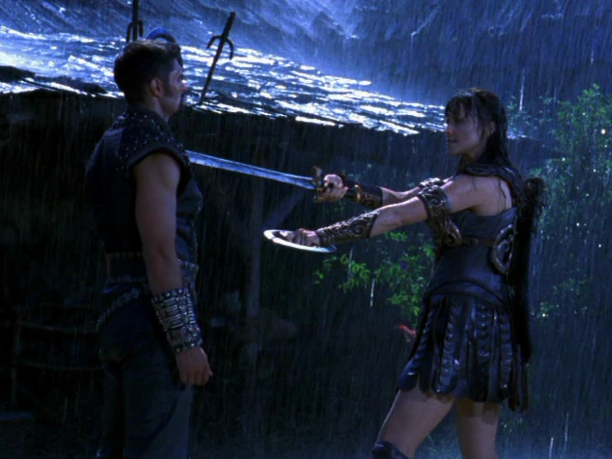 Ares confronts Xena in the rain