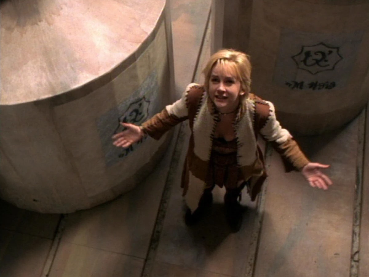 Joxer and Lachrymose talk some more. Joxer sobs. Xena sleeps, then gets up and goes to the tavern. The warlord's brother appears with a knife, Xena knocks him out. Xena enters the tavern and asks if anyone has seen a guy in a funny hat. There is a convention of funny hat men in the tavern. They are not amused. Xena says fine. Everyone has deserted her, but Argo is always there. She whistles for Argo. Argo is with the little Gabrielle, and the pony bolts, leaving Gabrielle watching Joxer and Lachrymose. Lachrymose sees Gabrielle and starts after her. Gabrielle runs. Joxer says Gabrielle would be easier to find if she were normal and Lachrymose zaps her back to regular size. Xena sees the shrunken Argo. Clips of Xena turning into monsters and being really angry. She yells out Gabrielle's name.