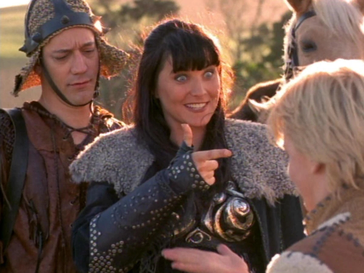 - Renee O’Connor mentioned in The Chakram Newsletter issue 11, that they for pie fight, they made whipped cream and mashed potatoes, which were being thrown at the actors from off camera. "It wasn’t painful, but so ironic. I do all these bizarre fights and never get hurt. Then I do a pie fight with whipped cream and I get cut. We had a good time. Actually, we probably had more fun than we should have…" Renee recalled that it was not scripted that a Pie be thrown at Lucy's direction because she was pregnant at the time of filming this episode.