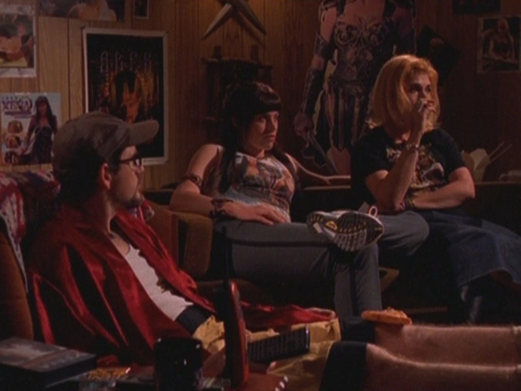Meanwhile, in an apartment, three die-hard 'Xena: Warrior Princess" fans, Clea, Polly and Mac watch numerous episodes of the show, choosing key clips. Cut to the footage from Them Bones, Them Bones where Xena tricks Alti into entering her own dreamscape.We watch up to the point Alti's skeleton assembles, then the scene freezes. The scene cuts to the room of a basic Xenaphile. Videos are strewn across the floor. Pictures of Xena and Gabrielle cover the walls. There is a Xena standee and a chakram. They're talking, saying they should use this footage. Alexis calls to inform them that phase one is complete and asks how the clip reels are coming. Promising to meet Alexis at her laboratory in 72 hours, the three fans agree that for the good of Xena, Gabrielle and the world, their plan had better work.