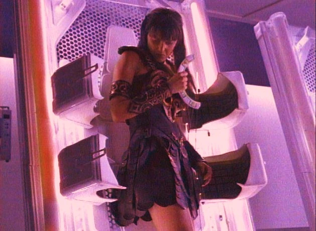 Inside the lab, Xena and the fans are discussing the role of Joxer when Alexis barges in and reports that Gabrielle has been arrested. Lying, she says that Gabrielle curiously climbed into the police car and then pulled her sais on the cops. Alexis immediately gives Xena directions to the city jail and hands over her chakram. Now suspicious, Clea inquires where the chakram came from. Before their eyes, Alexis morphs into Xena's enemy Alti, revealing that she had recreated the evil Xena so they could unite and take over the world.