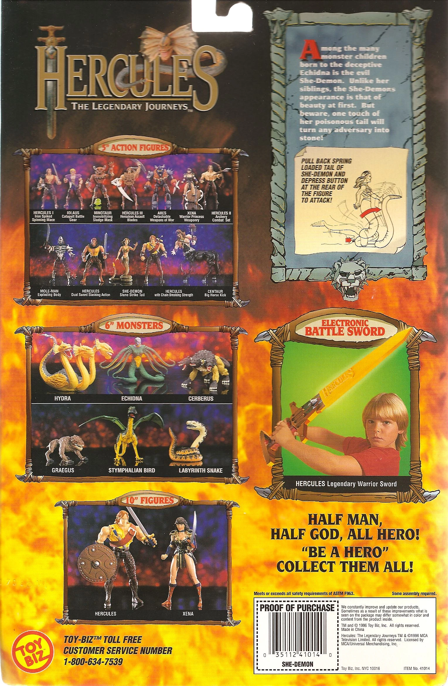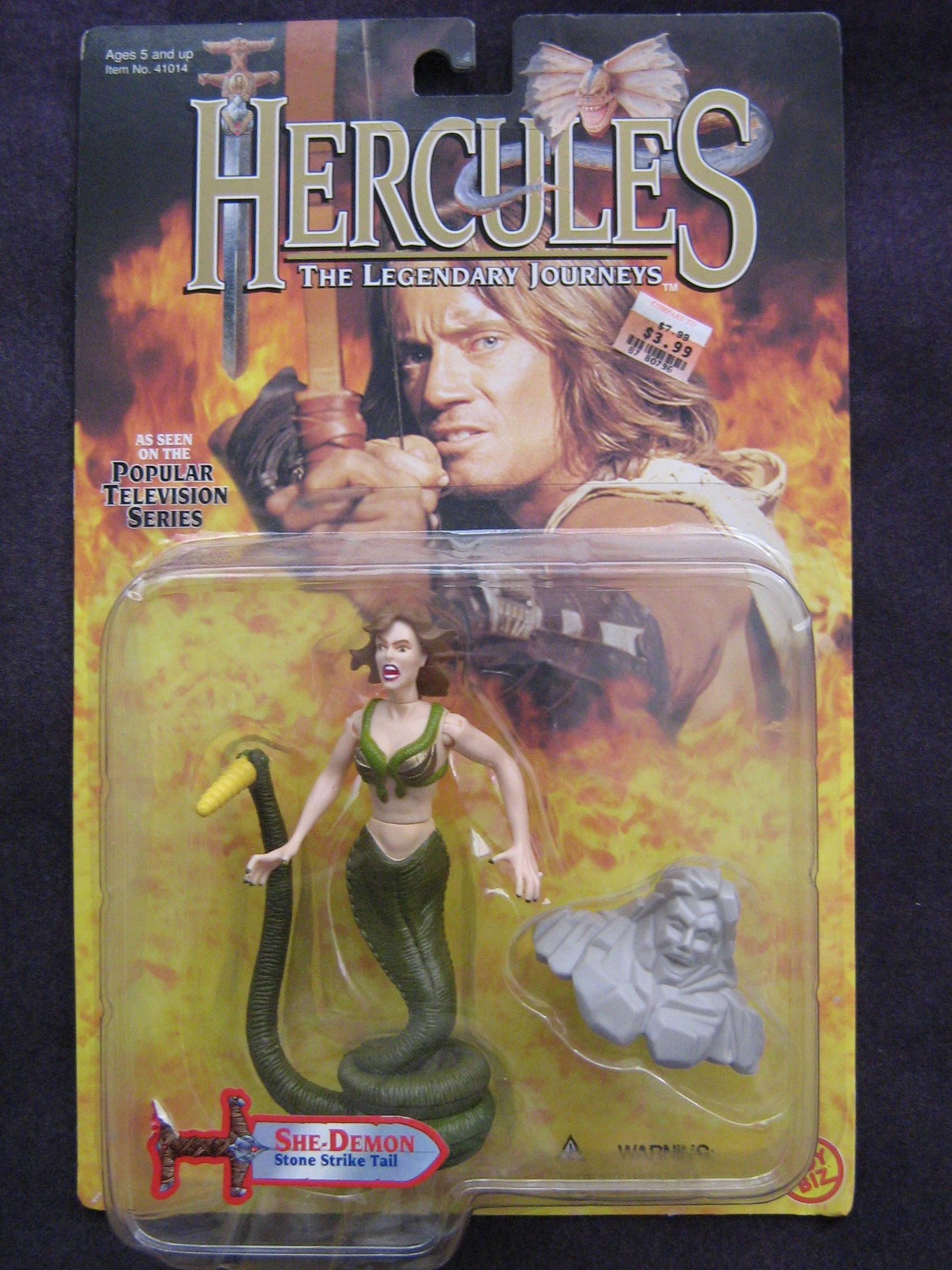 From Wave Two of the ToyBiz HTLJ 5 inch action figure line. The She-Demon as seen in "The Wrong Path." The She-Demon has a spring-loaded tail. To make her attack, you pull back the tail and then press a button at the bottom to make it spring forward. The She-Demon also comes with a "stone" face mask which will fit over the heads and shoulders of the Hercules and Iolaus figures so you can turn them into stone!