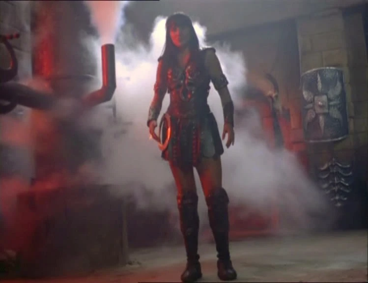 Xena finally makes her way to the armory where Walsim and another warrior charge her. But Xena manages to unlock the cabinets containing the formidable weapons with her chakram. She and the others quickly throw them into the fire, plugging the furnace pit with a boulder which causes the pressure to build.