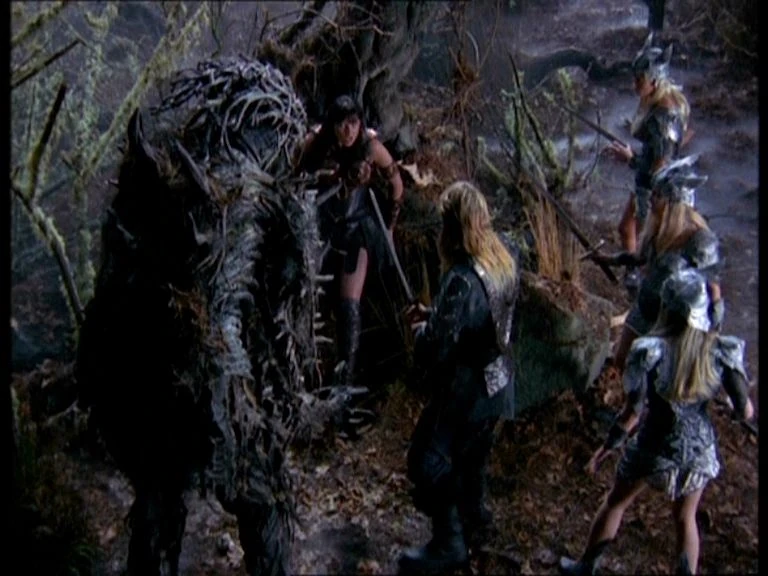 Gabrielle, Beowulf and Brunnhilda follow the tracks of Grindl through the woods to find Xena.