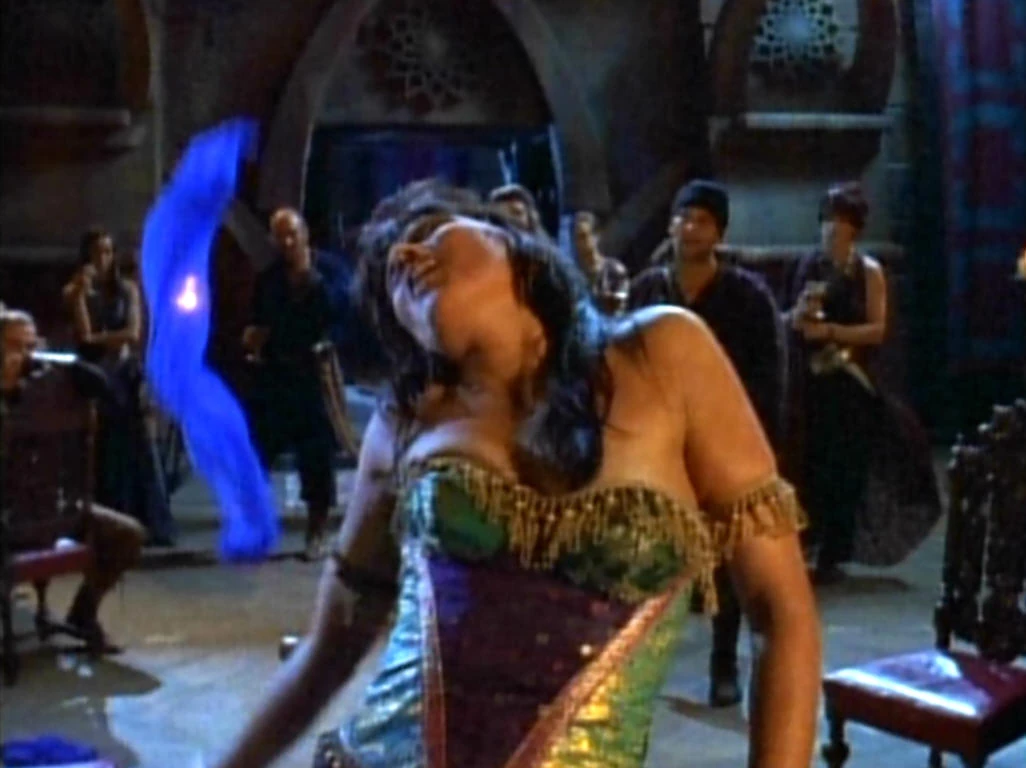 In the castle banquet hall that night, Malthus unveils the chest, which is protected by an elaborate security system, as well as tells his guests that the weapon will be demonstrated the following day. Needing a diversion, Autolycus proclaims that his concubine Cherish will perform her dance of the three veils to entertain Malthus and his visitors. As Xena begins the wild and sensuous dance, Autolycus goes to work, secretly making a wax impression of the banquet hall key which hangs around Malthus' waist.