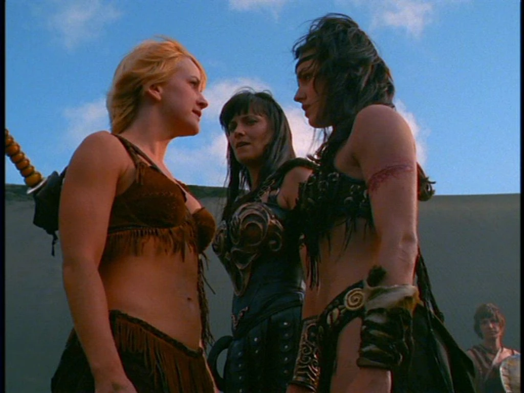 Gabrielle stands alone with her sword when Xena approaches to check on her. Though Gabrielle insists she’s fine, Xena senses her pain. Gabrielle admits she’s struggling but refuses comfort, saying she must stay cold and ruthless after losing half her tribe in battle. Determined to protect the surviving Amazons, she steels herself for what’s to come. Xena urges her to finish the fight, and Gabrielle agrees. Nearby, Varia overhears their exchange, moved to tears by Gabrielle’s resolve. Shocked by Gabrielle's steely resolve, Xena rides to Bellerophon's castle and challenges him to a one on one brawl.