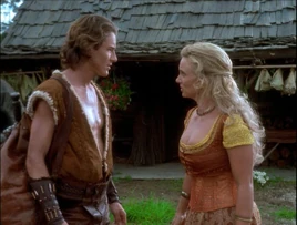 Young Alcmene is working and young Hercules comes out to help. Young Jason and Iolaus arrive and state that they must go help fight the evil Parthans, enemies of Corinth. Alcmene is worried but young Hercules decides he must stand up for what he believe in. He hugs his mother goodbye and the three guys head off to battle, as Hercules will have his first war experience. Alcmenes face has the worried look on it as her son and his friends leave for battle nearby.