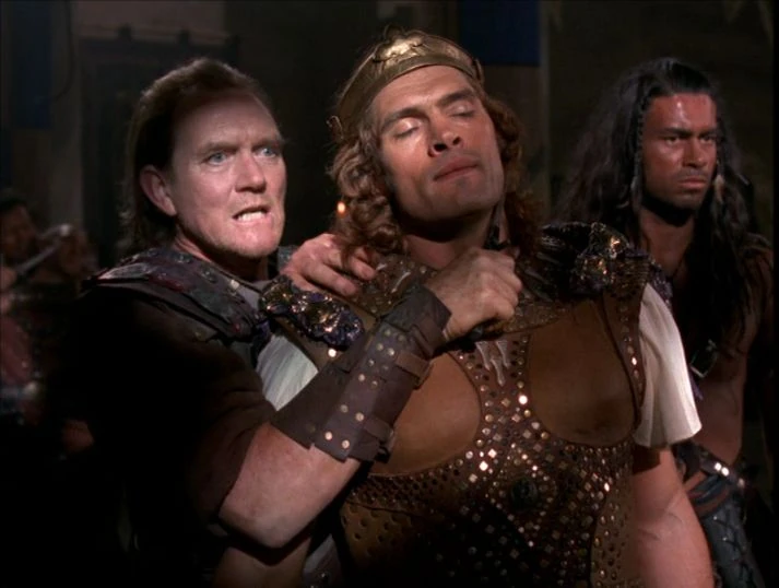 Iphicles and Iolaus have a small talk and Iolaus learn that Iphicles' wife, Rena, passed away and that he wasn't there to be with her because of the vets; and he's punishing them for his pain. Iolaus tells Iphicles to talk with Ajax. Instead of talking, Ajax takes matters into his own hands and kidnaps the king for ordering that the rest of the vets leave Corinth immediately, while forcing the vets already at Golgoth to stay there.
