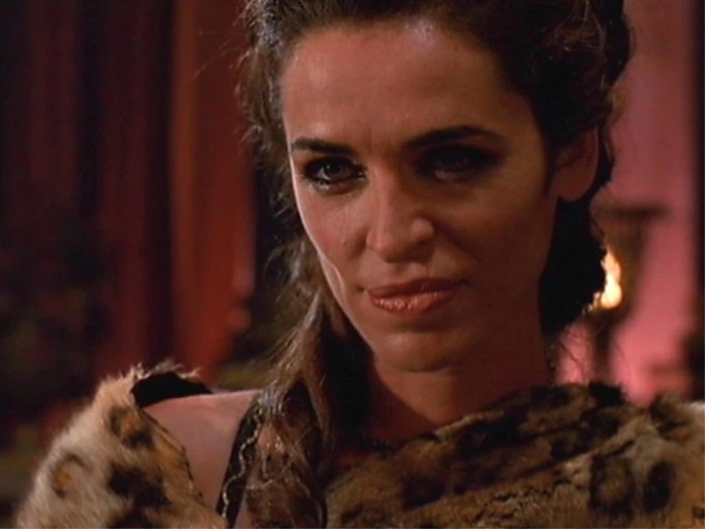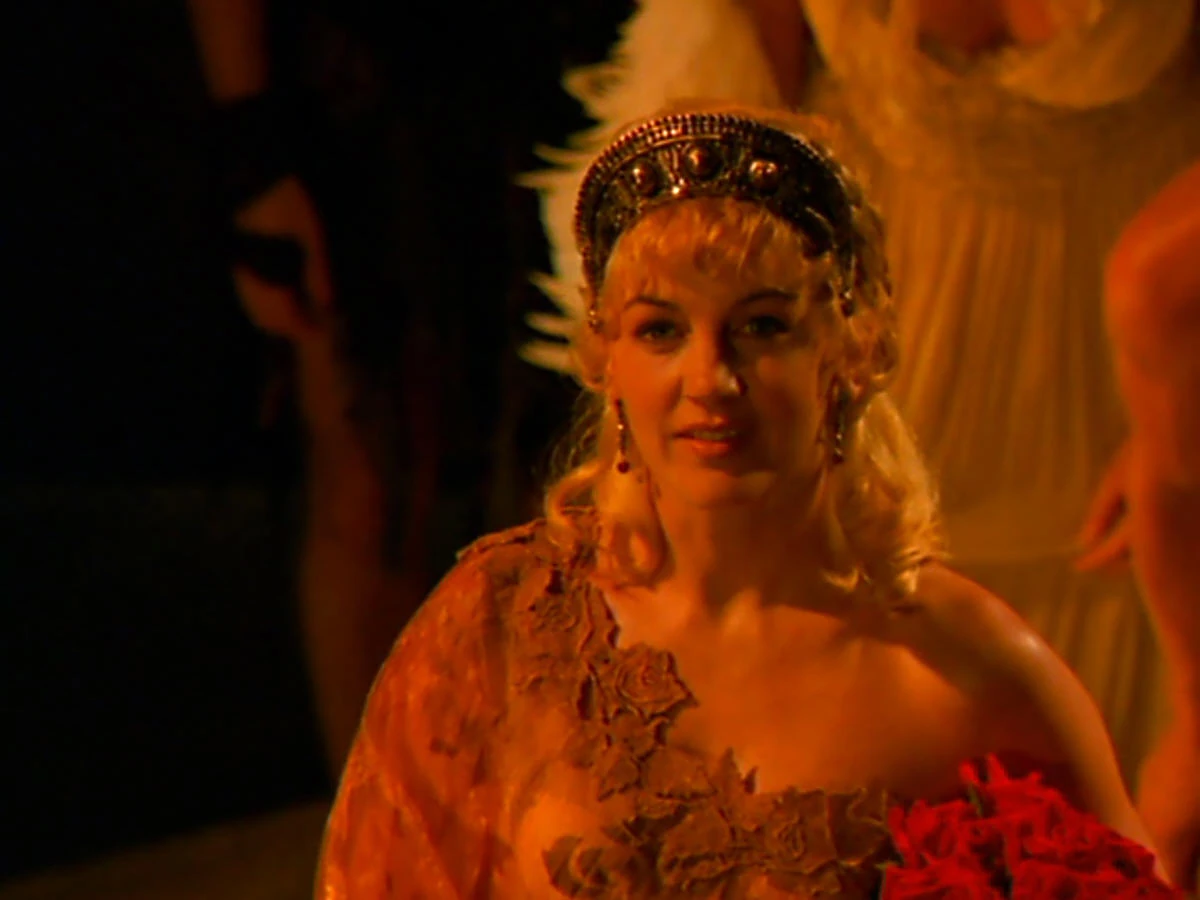 Xena's regal bearing is immediately apparent when she joins Caesar on the balcony of the royal stateroom as he delivers his "Friends, Romans and Countrymen" speech, announcing that the Senate has unanimously voted to make him Emperor and Xena Empress for life. In this universe, Caesar succeeds in completing his infamous "assassination" speech to thunderous applause from the crowd.