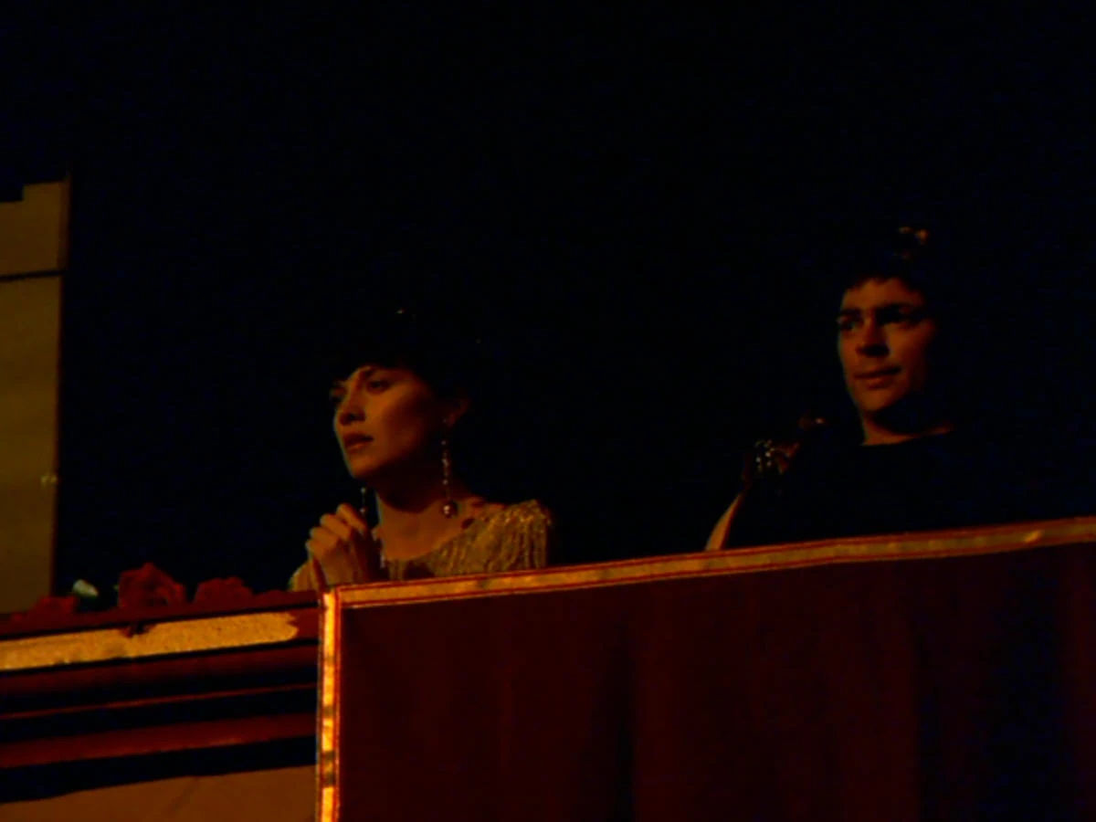 Xena and Caesar on the balcony watch a play.