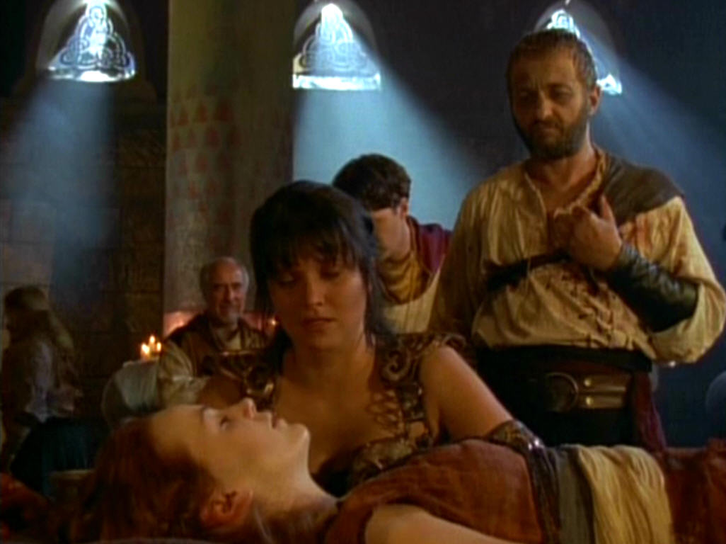 | Xena is hit by an arrow whilst defending a village, rendering her unable to stop their brutal attack. While she recuperates in the care of a local family, Gabrielle is left to fend for herself in a tavern while awaiting Xena's return and unknowingly befriends the person who shot Xena. | ||||||